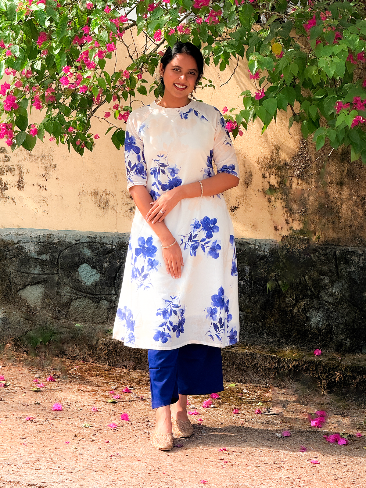 This beautiful ensemble features a white A-line Raglan sleeve kurta adorned with vibrant, hand-painted style blue floral prints, offering a fresh and summery aesthetic. The kurta has a classic round neck and three-quarter length sleeves, providing a comfortable yet chic fit. It is...